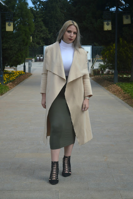 For this simple look, Lara wore an army green midi skirt which she paired with this white sleevless polo-neck. She then paired her beige duster coat for when it's slightly windy (like today) and finished off the look with her black heels. How simple is that, am I right?